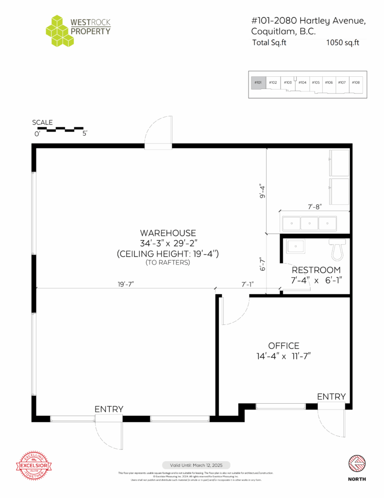 The unit features 1,050 sq. ft. of space with high ceilings and ample storage. It includes a mezzanine for additional space, as well as a combination of office and storage areas. The unit is equipped with sprinklers (not monitored) and is zoned M9 – Light Industrial.